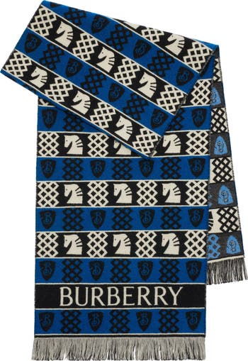 An Italian-made wool scarf, woven with our logo, B shield and Knight chess piece – a modern take on traditional Fair Isle patterns. The design is finished with delicate fringing.||Rectangular|Fringing at both ends|Woven Burberry lettering at hem