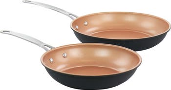 Create the perfect main course and side dish with the Gibson Home Chestnut 2 Piece Nonstick Carbon Steel Frying Pan Set in Copper. Donning a stylish matte black bottom and a copper top surface, each piece suits any decorated kitchen. The copper nonstick cooking surface is a Xylan PFOA free coating for easy low fat cooking. Cut down on oils and fats for healthier meals. For long lasting quality, hand wash the carbon steel cookware and avoid abrasive material such as steel wool. Enjoy cooking up shrimp scampi, Parmesan gnocchi, fried tilapia and other delectable meals.