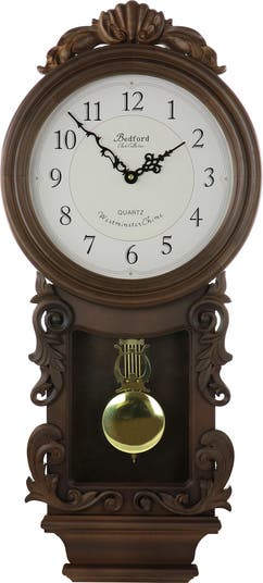Bedford Clock Collection offers you the elegance and beauty of classic style with the modern reliable technology of today's wall clocks. Whether a gift to yourself or for someone else, this clock will add a special touch of sophistication to any room. With it's stunning Golden Oak finish, Golden Accents and Swinging Pendulum, this time piece is not only an attractive focal point, but a functional and reliable piece of technology. With 4 distinct Chimes, the clock will announce the beginning of each new hour for your convenience. Carved details and special touches throughout, as well as a convenient Sleep Mode. Item Dimensions: 13.75" x 4.50" x 31.00" Item Weight: 7.85lbs
