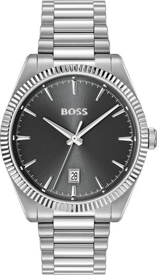 A fluted bezel classically frames the slimline case of this everyday elegant bracelet watch in a mix of brushed and polished stainless steel.