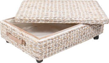 Store away your extra blankets or clothing with our slim wheeling handwoven basket. Decked out a lid and long rectangular shape, this basket is perfect for organizing items under your bed. Made of a wooden frame and hyacinth weaving, this storage bin adds a touch of bohemian and coastal decor to any home.