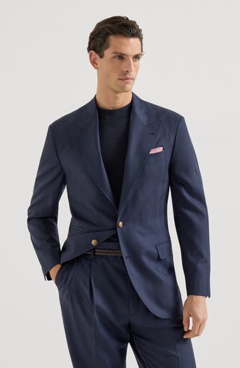 - Horn button closurePeak lapelCuffs have four horn buttons and functional buttonholesWelt pockets with flap, ticket pocket and chest pocketCupro half liningTwo interior pockets with button closure and pen holderDouble back ventDrop 7