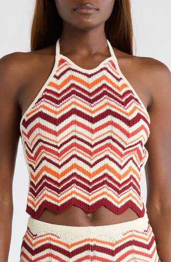 A chevron-knit design keeps you cool from point A to beach in this halter crop top fitted with adjustable back straps.
