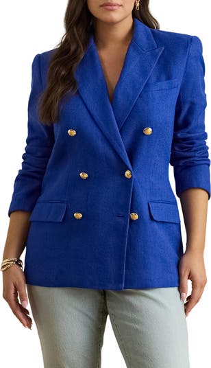 Crested buttons and a double-breasted silhouette bring timeless style to a bold blue blazer polished with peaked lapels.