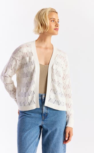 Airy chevron-knit cardigan, open front and soft drape that flatters a relaxed silhouette for sunlit weekends and easy layering.