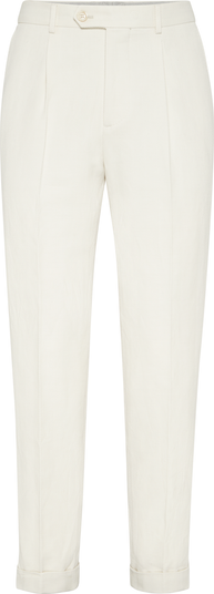 The blend of cotton and linen fibers gives a slight slubbed effect to the surface of the cavalry, which has a crisp yet soft feel, enriched by the classic, tailored chevron pattern.