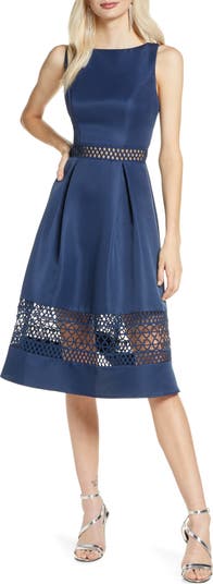 Crochet insets detail the waist and hemline of a twirly fit-and-flare dress with a structured bodice and low-cut back.
