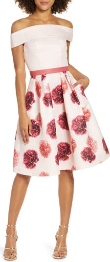 A flouncy party dress enchants with a twirl-worthy skirt printed with lavish carnation blossoms with reach-out-and-pick-me realism. A sleek, shoulder-baring bodice adds to the allure.