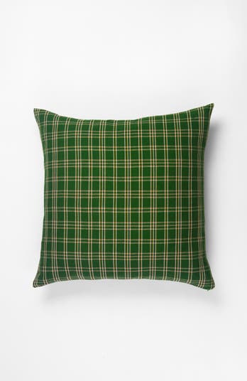 Forest green plaid throw pillow, ethically handwoven by artisans in Chiapas, Mexico on traditional footlooms. With hints of ochre and burgundy, this update on a classic plaid will be a lively addition to any decor.