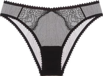 Picot trim frames the delicate silhouette of these sultry and sheer mesh briefs punctuated with floral lace.