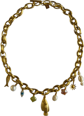Another dream necklace inspired by my Italian summer <3 18" 12k antiqued gold plated brass 1:2 link chain with freshwater pearl charms, freshwater star charms, mother of pearl evil eye charms, 22k gold plated brass fish charms, 22k gold plated brass daisy charms, and a 22k gold plated stainless steel clasp