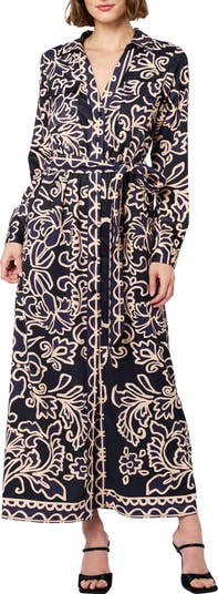A drapey tie defines the waist of this polished shirtdress made in a longline silhouette and covered in a bold swirling print.