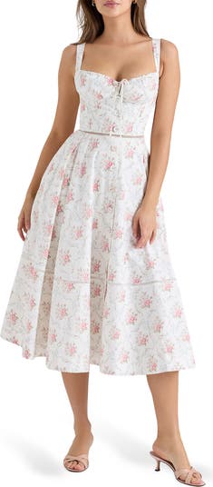 Corset lacing down the back amplifies the vintage-inspired romance of an A-line midi dress in a dreamy rose print.