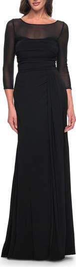 Long chic evening dress with illusion neckline and three quarter sleeves. Ruching on the bodice and draped detail on the skirt. Back zipper closure.