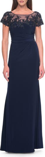 Soft stretch jersey evening dress with flattering side ruching. The top features a high illusion neckline and beaded lace applique details. Back zipper closure.