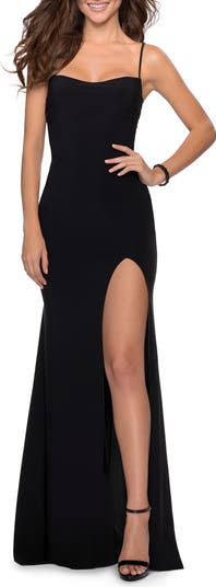 Chic jersey prom dress with soft scoop neckline and intricate lace up back. A flattering side leg slit completes the look. Back zipper closure.