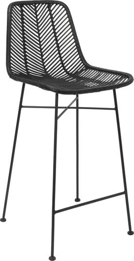 This rattan and black metal bar stool brings tropical vibes to any home. The black rattan seat has a high back and a curved shape that hugs the body and provides comfort and support. The black metal frame provides a contrast of color and material and has a footrest for extra convenience. The bar stool is made of rattan and metal, which are durable and stylish materials that can withstand indoor or outdoor use. The bar stool requires no assembly, so it is ready for use right away. The bar stool has a length of 20.5 inches, a width of 17 inches, and a height of 40.5 inches, with a seat height of 28 inches that fits most standard bar heights. This bar stool has a maximum weight capacity of 275 pounds and can be used in a kitchen, dining room, or patio, where it adds style and functionality to any space. Whether enjoying a drink, a meal, or a conversation, this rattan and black metal bar stool makes one feel like in a tropical paradise. Cover or store inside during inclement weather or when not in use.