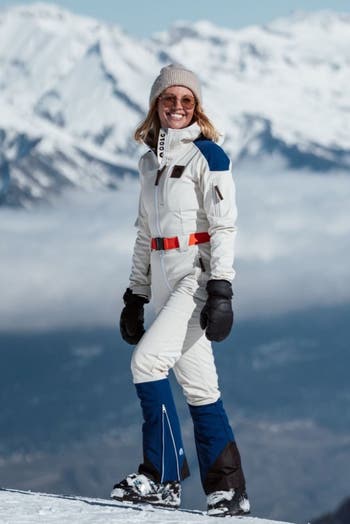 Model information - Height 5ft 6 | US SIZE 4 | Wearing size Small At a Glance Features: OOSC are pleased to bring you our Luxury Women's Ski Suit range. Our chic, figure hugging suits are designed to make you feel great whilst delivering the performance on the slopes you expect! We are empowering you to rip up the slopes with panache & style, whilst dropping jaws & turning heads as you strut into Après like a star as the beat drops. Our suits are 10k waterproof and breathable and feature waterproof YKK Aquaguard zips to keep the snow out! On top of this all of our amazing Chic suits are made from recycled polyester & are lined with fleece made from 100% recycled polyester to keep you toasty warm all season long; meaning you can look amazing and do your bit for the planet at the same time! Our women's chic luxury ski ski suit in Cream & Navy Blue is fitted and tight through the bum and thighs then slightly flares out at the bottom of the legs over the boots. It also has a colour coded belt for a bit of added style. It features a liftpass pocket, internal and external phone pocket, 2 hip pockets, ankle gaitors as well as an adjustable ankle gusset for comfort. Other Features: Water Proof YKK Exposed Zippers Lift Pass Pocket Velcro Adjustable cuffs for comfort Goggle Pocket Helmet Adaptable Hood Reinforced Durable Ankle Patches Shaped Elbows & Knees Elasticated Ankle Gaitors Adjustable ankle gusset Elasticated Waist & Adjustable Belt Internal mesh pocket 3 external pockets Full list of our technical features. OOSC are extremely proud to have be able to say that ALL of our outerwear is made from Recycled Polyester and each Chic suit is made from at least 100 plastic bottles!! (Read about how our suits are made from plastic bottles)