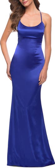 Long stretch satin dress with U neckline and open criss-cross strappy back. Back zipper closure.