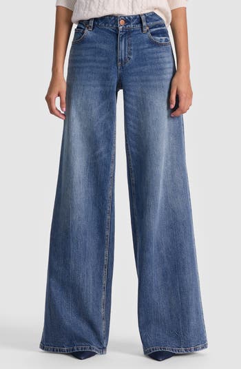 Fashioned from nonstretch denim, these full-length jeans create a vintage-chic aesthetic with a faded wash, artful whiskering and wide legs.