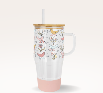 A 32oz glass tumbler featuring an allover design of chicken in rain boots with wildflower accents in a soft pastel color pallet. Applied using UVDTF printing, in which UV-cured inks are transferred directly onto the glass surface for a durable, glossy finish that does not peel or fade. Includes a natural lid with a removable silicone lid protector for a snug, spill-resistant seal, a clear plastic straw, and a matching pink food-grade silicone boot cover that protects the base from scratches and impact. Designed and produced in Lafayette, Louisiana by a women-owned team. Suitable for hot and cold beverages. Ships in 1 to 3 business days.