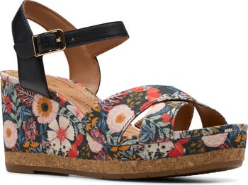 Bring delightful color and charm to your look with this chunky wedge sandal covered in a bright floral print.