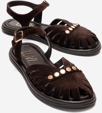 A refined ankle-strap sandal that combines soft suede texture with subtle gold hardware for effortless city style