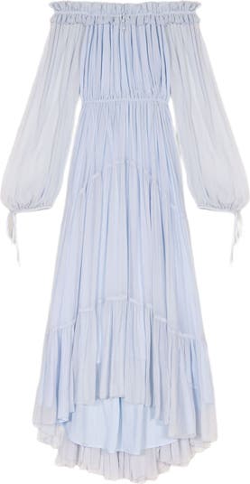 With comfortable materials and pastel colours, our collection celebrates a new kind of romanticism, where the Maje woman asserts herself confidently and effortlessly everyday. One of the studio's favourites, this chiffon midi dress features ruffles and dainty pleats for a romantic look. Its elasticated, buttoned neckline can be adjusted to suit your mood: you can opt for bare shoulders or a round neck. The long sleeves and cuffs with ties create an interplay of see-through details, while the asymmetric panelled skirt gives it a light, airy look. Perfect for special occasions, it can be worn with wedge sandals for a chic look.