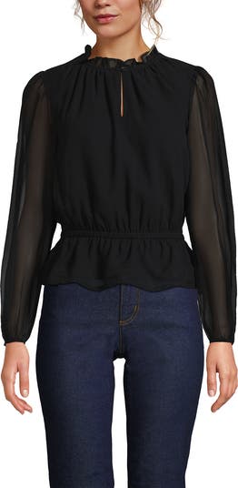 Soft, flowy and full of feminine charm, this chiffon top brings timeless romance to any outfit. The light and airy fabric drapes beautifully, with a flattering peplum flare at the waist and delicate shirring through the crepe-lined body. A high ruffled neckline and keyhole back add extra elegance, while long sleeves complete the graceful silhouette. Perfect for date nights, dinners or any moment that calls for a little something special.