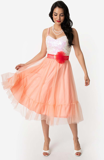 The sweetest lady in the state, the Peaches ’N Cream Dress from Unique Vintage is all about making magic at a special occasion. Originally released in 1984, this dreamy life-sized reproduction boasts a gorgeous peach chiffon as the elegant bodice shimmers with an iridescent glow. Covered in a delicate white mesh and twinkling with iridescent sequins throughout, the sweetheart neckline is secured by adjustable spaghetti straps as subtle padding and side boning provide a structured and flattering shape. A splendid mesh sash centers your hourglass as the delectable layers of peach chiffon mesh gather at the waist and cascade to a gentle ruffled hem that dances past your knees. A dual layer of peach poly satin lining keeps you comfortable while a sweet pop of tulle keeps your feeling flirtatious and graceful whether you’re making cobbler or tea.