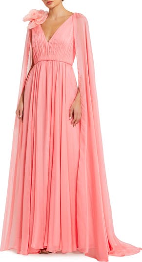 Flowing chiffon gown with a pleated V-neck bodice, cape sleeves, and floral shoulder detail. An elegant silhouette perfect for formal events and special occasions.