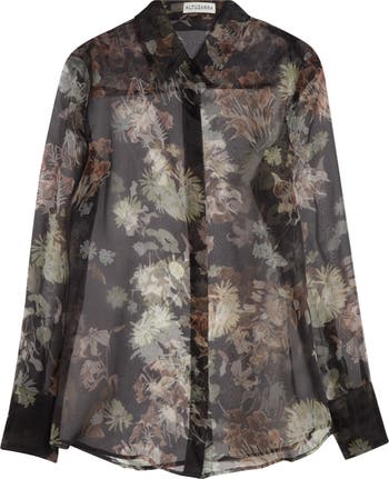 For fall '25, Joseph Altuzarra takes a page from his love of literature, translating painterly blooms into an inky botanical print on this sheer silk-organza shirt—mimicking the look of dried flowers hastily pressed in books.