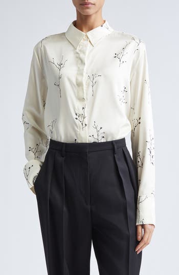 For fall '25, Joseph Altuzarra takes a page from his love of literature, translating inky blooms into an illustrated print on this fluid silk shirt—mimicking the look of dried flowers hastily sketched or pressed in books.