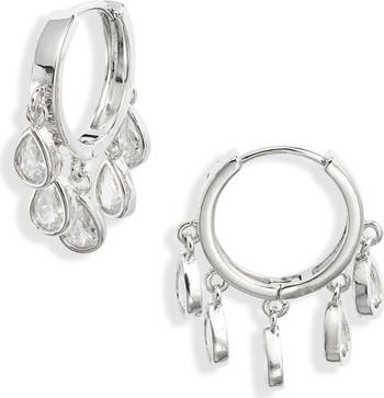 Polished rhodium-plated huggie hoop earrings dangle five teardrop-shaped, bezel-set cubic zirconia like chandelier drops that flash sparkle as you move.