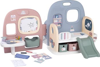 SMOBY CHILDCARE CENTER PLAYSET offers your child a large space to play and reproduce what he does or did at the childcare center or at the nanny's! Your child will be able to take care of his dolls during long hours of play thanks to the 5 different areas: entrance area, playing area, toilets area, nap area, eating/creative area. The house is easy to store thanks to the folding wall and the handle! Your little one will be able to start by welcoming his dolls, and then have them play in the playpen, teach them hygiene thanks to the toilet, have them take a nap, and feed them on the meal table. Also, the child will be able to do coloring with the coloring booklet and 6 colored pencils in the creative area. Thanks to the diversity of its play functions, this childcare center will have everything to please your child! It will allow him to imagine a thousand different stories and situations! The childcare center has many accessories to accompany the play functions: INCLUDES: 4 balls, 1 plate, 1 spoon, 1 yogurt, 1 felt pen, 1 rag, 1 coloring booklet, 6 colored pencils, 1 puzzle.