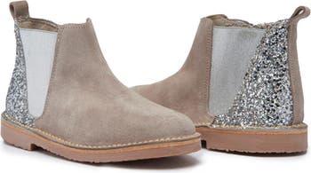 Your little trendsetter is ready to subvert style expectations with this completely revamped Chelsea boot handcrafted with sparkly glitter paneling to catch the light with every step.