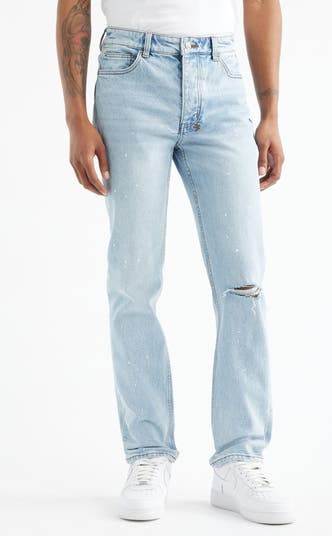 Faded, ripped and spattered with paint, these well-worn cotton jeans sport a fit that's slim but not skinny and offer a touch of stretch to keep you moving in comfort. They sit below the waist and taper below the knees in a contour-hugging profile that looks casual by day and ready for fun when the sun goes down.