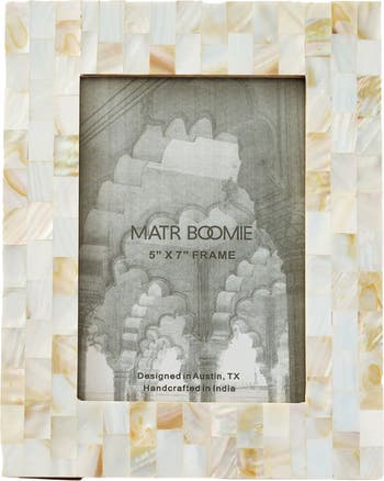 Our Chitra collection features mother of pearl inlaid mosaic tile. This picture frame is functional art which would make a great wedding gift or gift for another occasion like Mother's Day. The iridescent color of the tiles glisten as they catch the light illuminating the picture housed in the frame. Handcrafted by master artisans in India the frame features a two-way easel back, metal swivel tabs to access opening, glass cover and a metal d-rings for hanging vertically and horizontally. Sizes include: 4x6, 5x7
