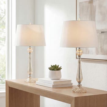 With a beautiful glass body in a stunning champagne color, this lamp is undeniably elegant. Inspired by Venetian crystal candlesticks, the shades of champagne and clear glass alternate to create a traditional but inventive combination of classic and inventive design. The look is completed with a crystal ball finial, silk-wrapped cord, and a white faux silk shade.