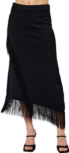 Fringe trim provides a dynamic update for this pull-on skirt complete with an asymmetric hemline.