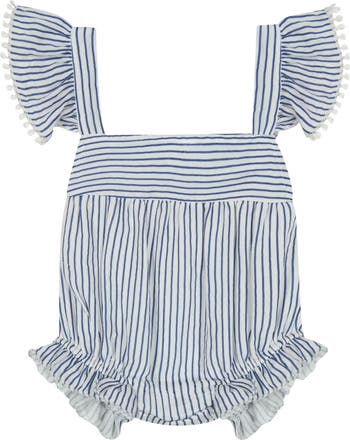 A sweet and delicate ruffled sleeve romper with adjustable straps and snap bottom closure. 100% cotton.