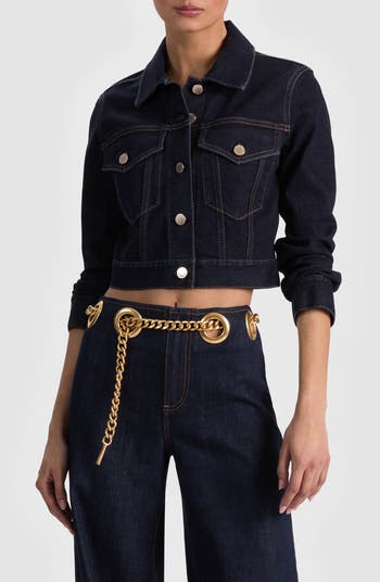 Show off timelessly cool style in this cropped trucker jacket cut from stretch denim in a clean, dark wash highlighted with contrast topstitching.