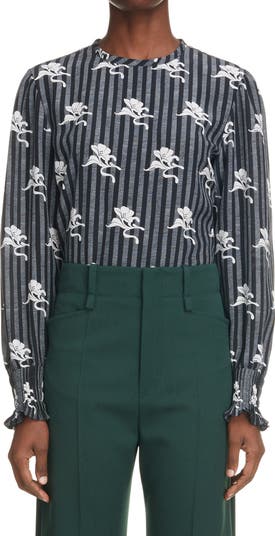 Pretty floral silhouettes punctuate the bold monochromatic stripes patterning this fluid silk blouse that offers some frill with smocked and ruffled cuffs.