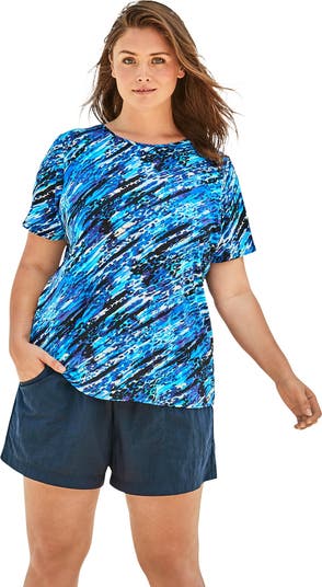 The Swim 365 Women’s Plus Size Scoop-Neck Blouson Tummy Control Two-Piece Swim Set offers relaxed coverage with a flattering, draped fit. The blouson top drapes comfortably with a supportive shelf bra, while the attached brief in the shorts provides power-mesh tummy control and smoothing. Flowy shorts ensure all-day comfort and confident coverage.