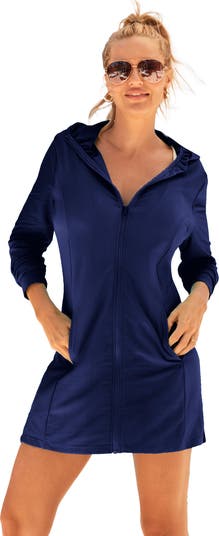 Sporty, sleek, and sun-safe. This quick-dry cover up dress features a zip-front design, hood, and side slits for easy versatility. Front and back princess seams create a flattering, contoured fit. Pockets hidden in the seams keep essentials close. Featuring chlorine-resistant and sun protective fabric for ultimate performance.