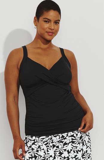 This tankini top provides coverage while showcasing your style. The eye-catching wrap front accentuates the bust, and the V-shaped neckline draws the eyes upward and elongates the body.