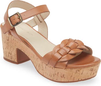 A chunky cork platform and heel ground a breezy sandal designed with smooth leather straps that are woven at the toe and secure the ankle.