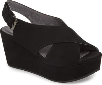 A lofty platform wedge adds contemporary sophistication to this streamlined slingback sandal.