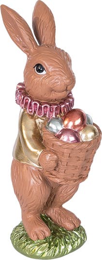 Welcome Easter with delightful elegance using this charming milk chocolate bunny figurine that brings warmth and whimsy to your seasonal decor. Standing approximately 6.42 inches tall, this beautifully crafted piece features durable polyresin construction with calcium carbonate composition that allows for exceptional detail and lasting quality. The figurine captures the inviting appearance of milk chocolate confection with its warm light brown finish that evokes the creamy richness of premium chocolate artistry. This endearing bunny stands upright in a sweet pose, showcasing intricate molded details from the textured fur and alert upright ears to the expressive eye and gentle facial features. An ornate rose gold metallic ruffled collar adorns the neck like an Elizabethan ruff, while a shimmering gold vest adds sophisticated charm. The bunny cradles a detailed woven basket filled with colorful metallic eggs in rose gold, silver, pink, and gold finishes that catch the light beautifully. A textured green grass base completes the springtime garden aesthetic.