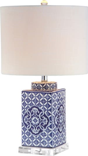 We love how a clear acrylic base lends this otherwise classic blue-and-white table lamp a splash of modern edge. A crisp linen drum shade with rolled edges tops the look. Finished with a lucite finial and silk-wrapped cord.